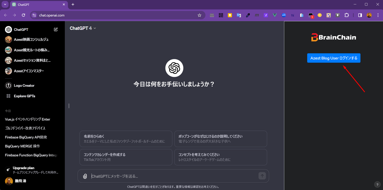 3.インストールした後、ChatGPTをアクセスすると、初めて利用の場合、「Azest Blog User ログインする」ボタンを押下してください。