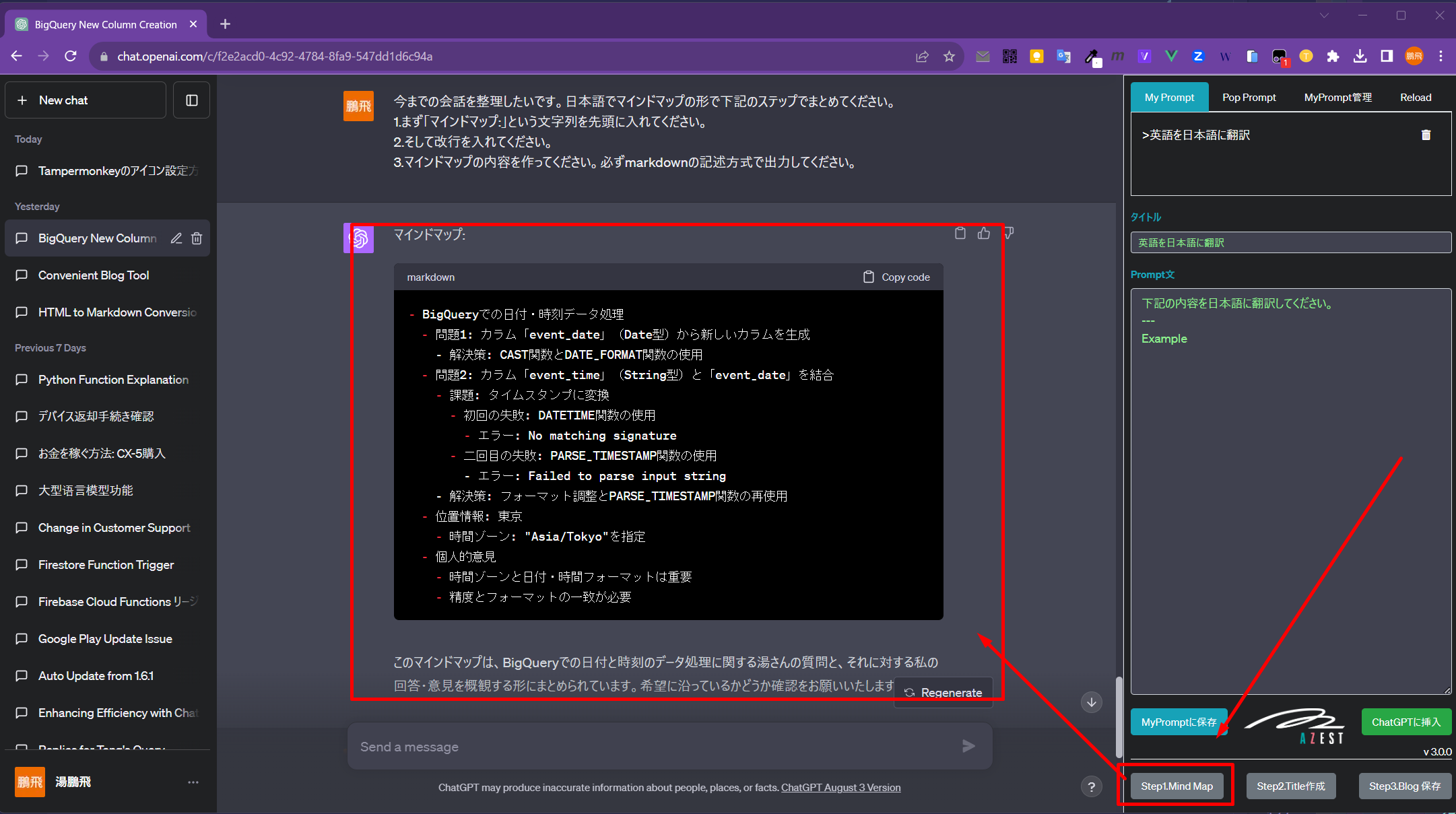 | 2.4.6 | 2023/04/24 | Promptの処理を追加: 「Step1.マインドマップ作成」のPromptコマンドがCodeベースの文字列が出力されず、ULの形でにしても文字列に変換できますように処理を加てみました。 |