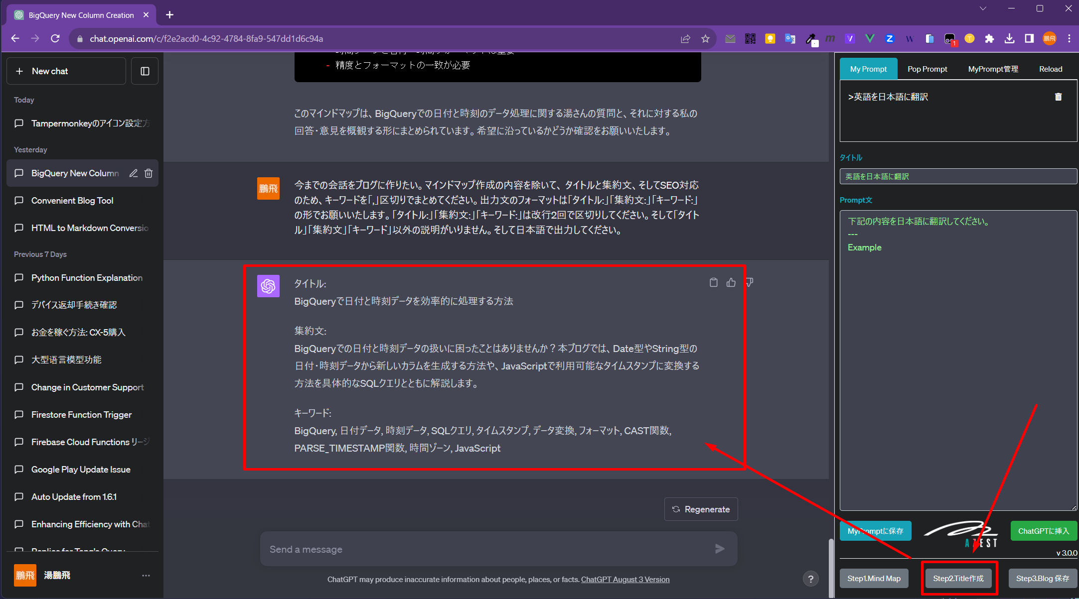 2.「Step2.Title作成」ボタンをクリックして、ChatGPTにタイトル、集約文、キーワードを自動生成します。