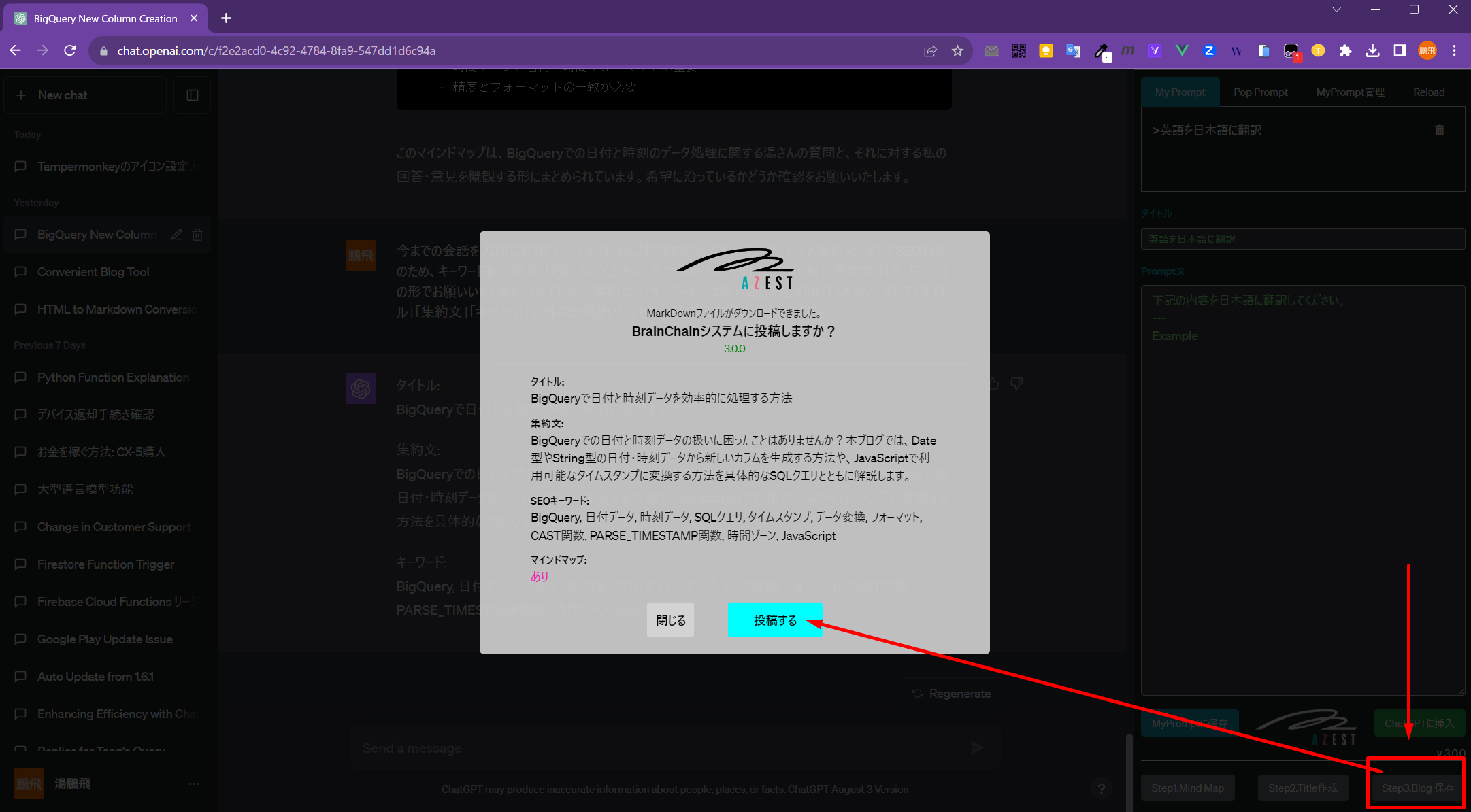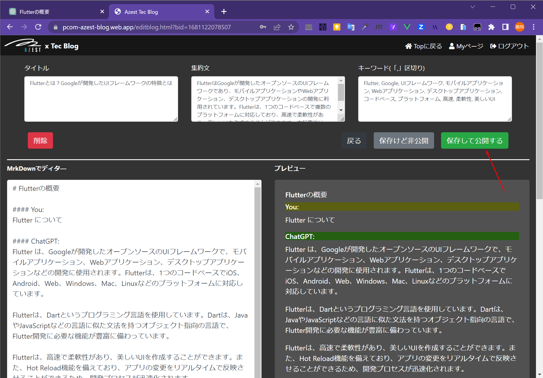 2.「Step2.AzestBlogに保存する」ボタンをクリックして、投稿する内容を確認します。確認終わりましたら、「投稿する」ボタンを押下してください。