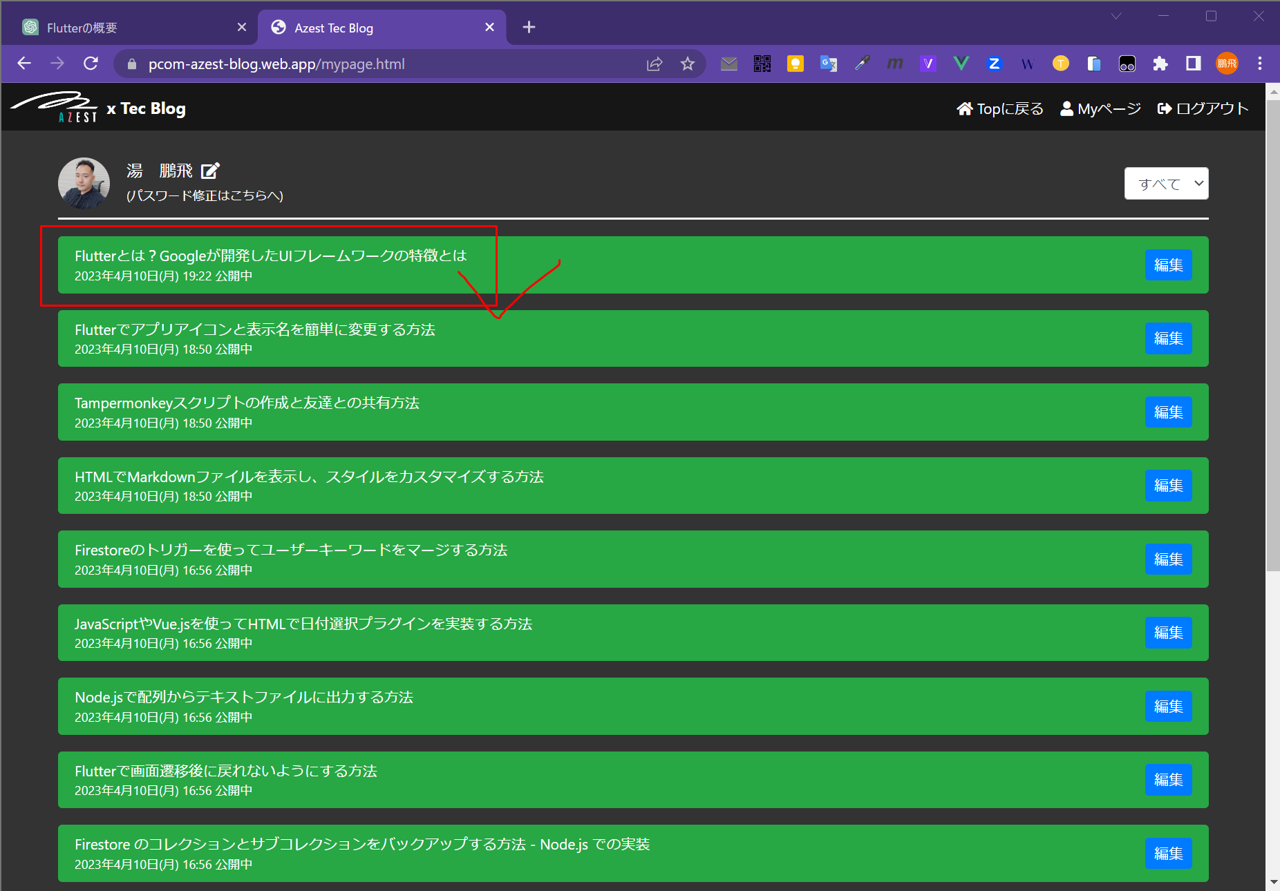 1.「Myページ」にて、ご自分で作成したブログを編集することができます。
